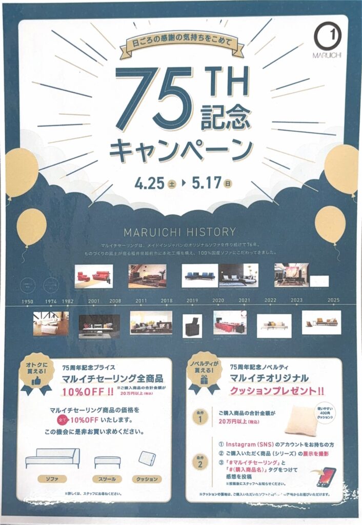 日頃のご愛顧に感謝の気持ちを込めて、当店にてお取り扱いしておりますマルイチセーリングの75周年記念キャンペーンをご案内いたします!
